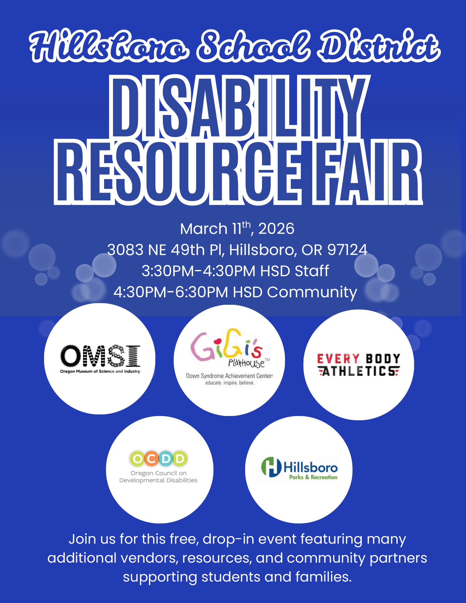 HSD’s Student Services department invites you to a Disability Resource Fair on Wednesday, March 11, at the District Administration Center. The event will be open to staff from 3:30 p.m. to 4:30 p.m., and to families from 4:30 p.m. to 6:30 p.m. Attendees will be able to meet and talk with staff who serve students with disabilities, visit with vendors and community partners, and learn more about available resources.